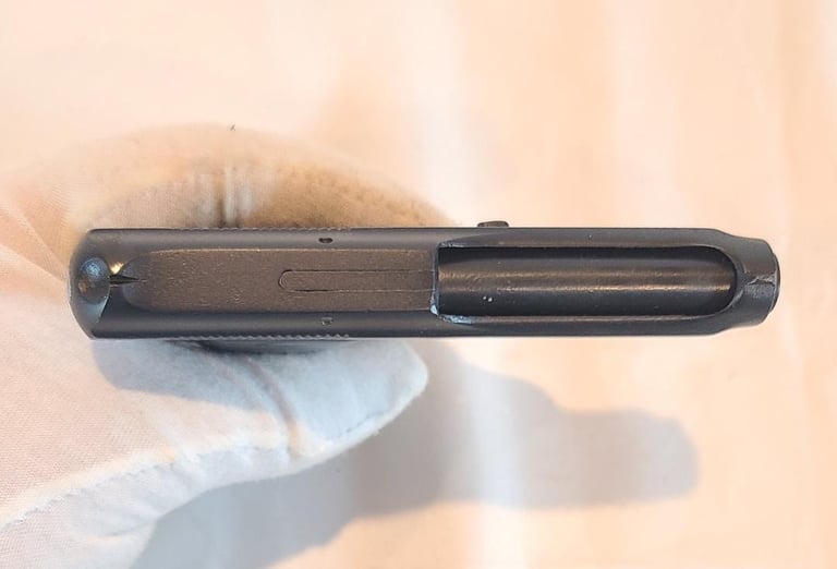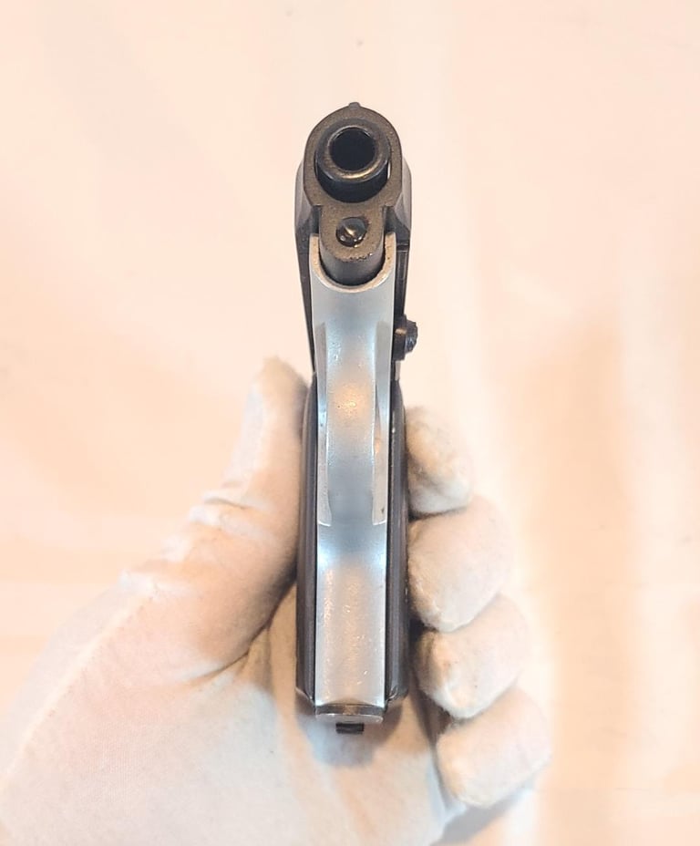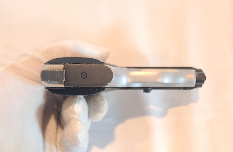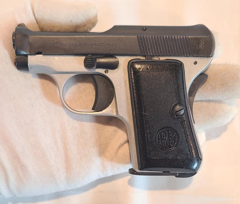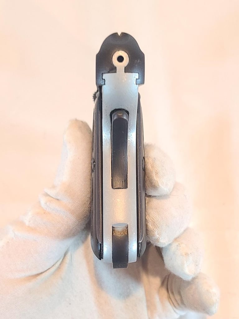 Here we have a two tone Beretta model 418 in 6.35mm (.25 ACP). Some of the markings are a bit soft and there are imperfections visible on close inspection which indicate that the pistol has likely been refinished. It does not show any loss of the current finish. The pistol appears to be in proper working order.