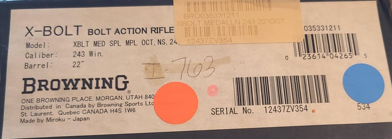 Here we have a New Old Stock Browning X-Bolt Medallion in .243 with with maple stock and octagonal Barrel. This model has been discontinued and this particular rifle comes from the inventory of a dealer who has gone out of business. The rifle is essentially new and has never been sold at the retail level, but is being sold as New Old Stock due to the box having some damage.