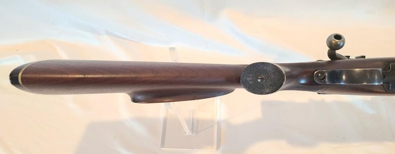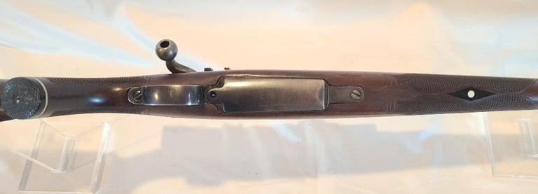Here we have a nice sporterized Eddystone 1917 in 30-06. Features a 23" barrel with Lyman ramped front sight, walnut stock with fleur-de-lis checkering, inlay and schnabel tip, Lyman sight base mounted on receiver, and Norman-Ford The Texan scope.