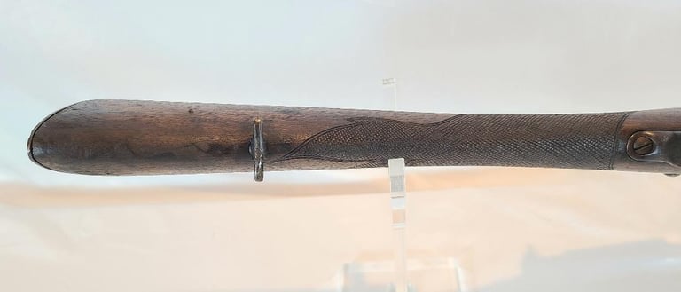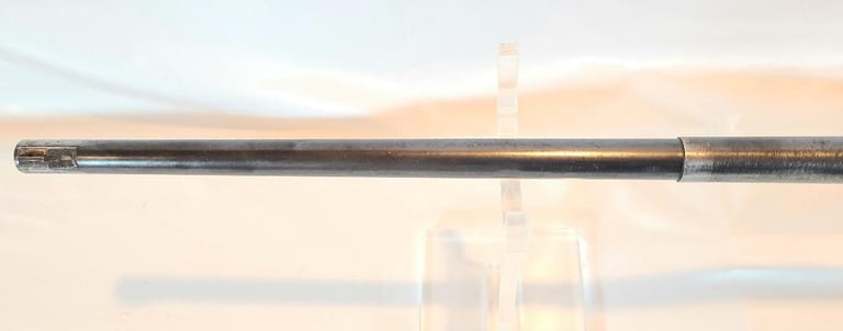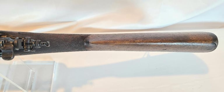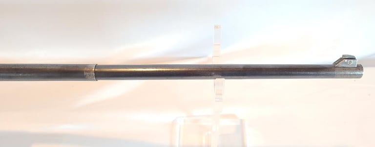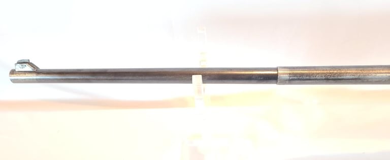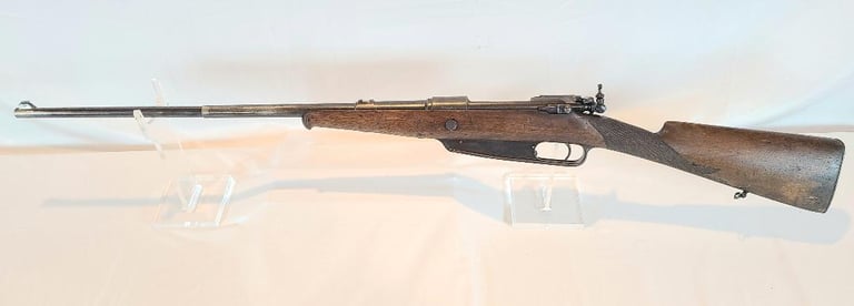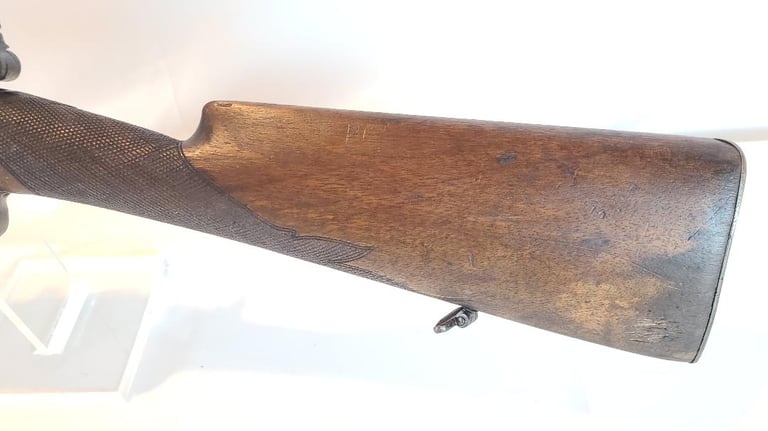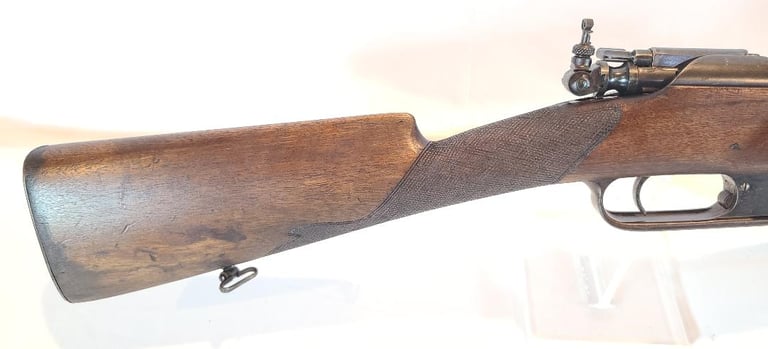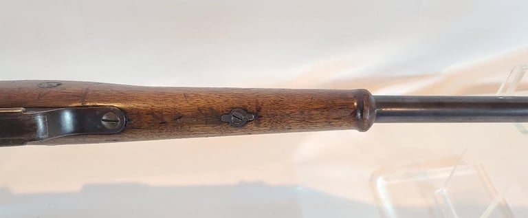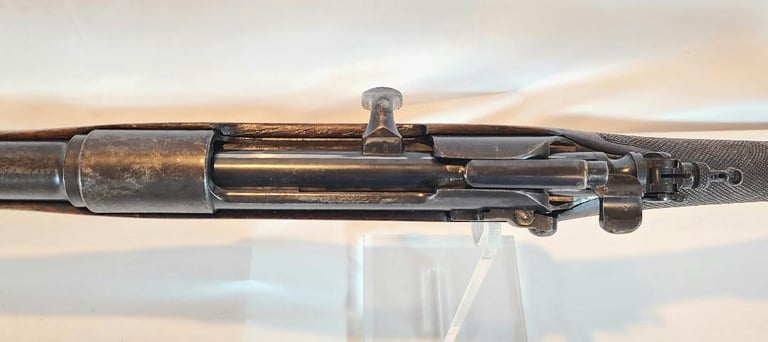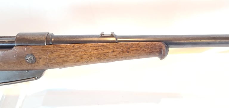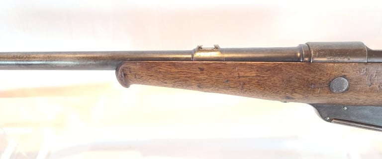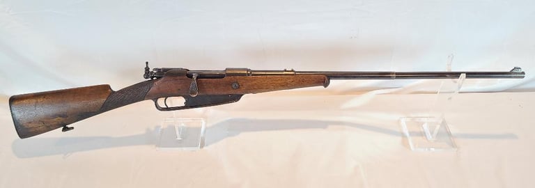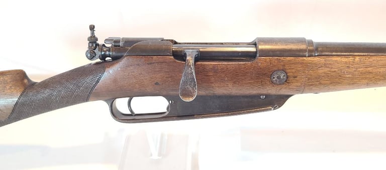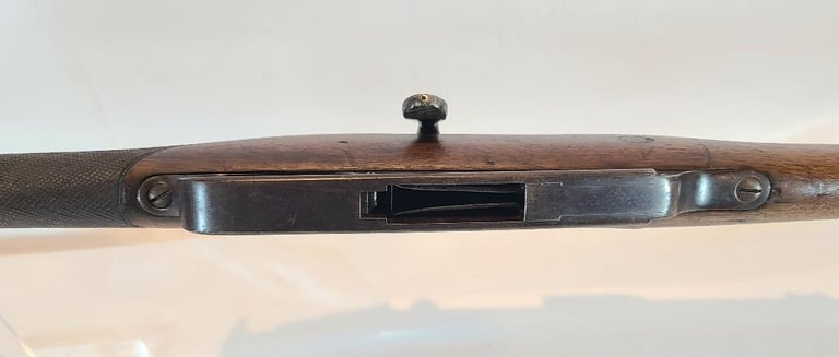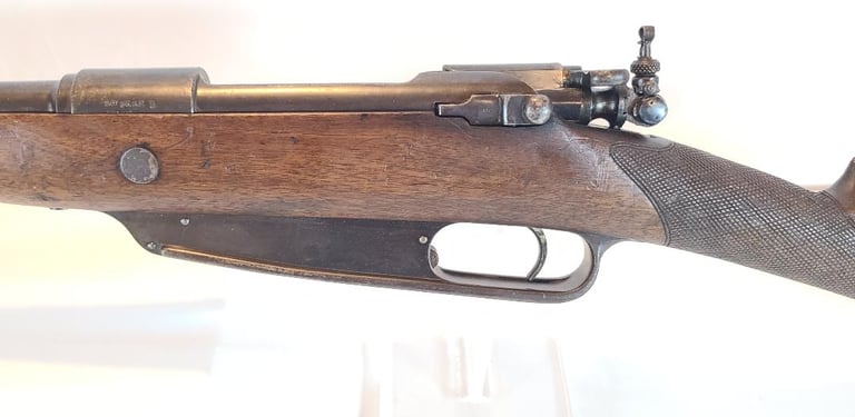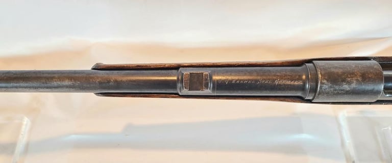 Here we have a C G Haenel model 1900 in 8mm. The rifle has a 24" barrel. Interestingly it features a bolt mounted peep sight. The rifle is in fair condition with moderate finish loss on the barrel receiver and bottom metal. The stock shows a variety of handling marks and some minor damage to the rear. Checkering is a bit worn but still has some grip to it. Appears to be in good working order. Bore is lightly frosted. Comes with one en bloc.