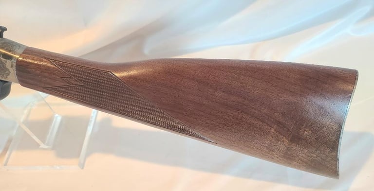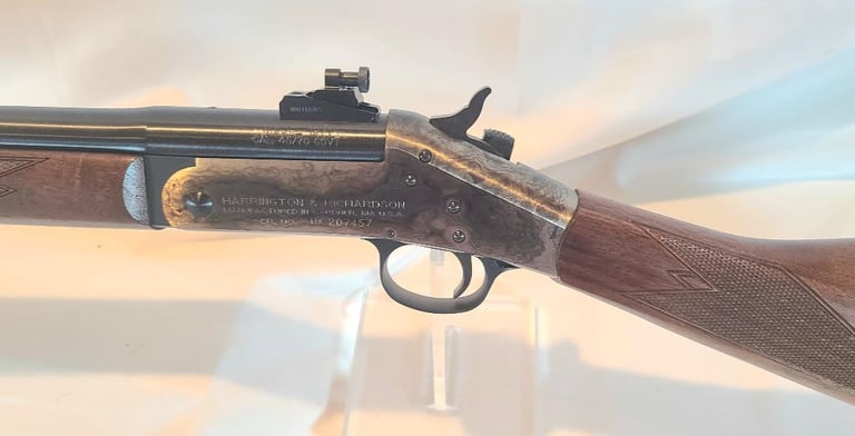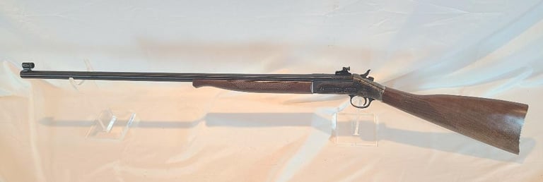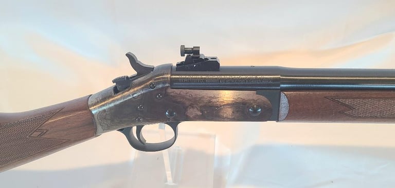 Here we have a Harrington & Richardson model 1871 .45-70 Buffalo Classic with 32" barrel. Rifle is fitted with Williams rear peep sight and globe front sight. Rifle is in excellent condition overall. Case harden receiver looks near perfect, bluing on barrel shows only minor marks and the wood shows only a few light handling marks. The rifle appears to function properly and has an excellent bright bore.