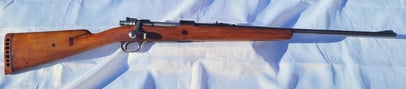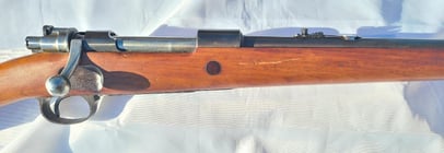 Here we have an interesting custom Mauser 98 that has been converted to a single shot 410 shotgun. The barrel is approximately 22" and it has a 3" chamber. It has a Savage front sight and a Marbles rear sight. Bluing is excellent with some minor marks on the bottom metal. Wood shows some typical dings and scratches, but no major damage. Everything appears to function as it should. The bore show some pitting towards the rear.