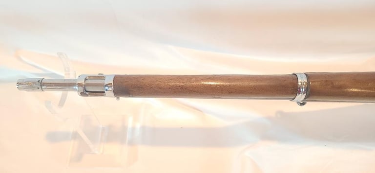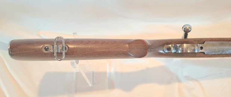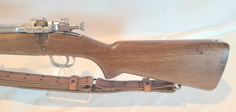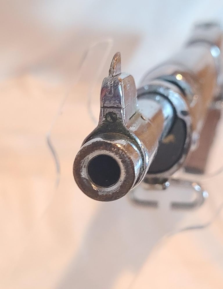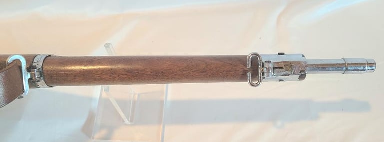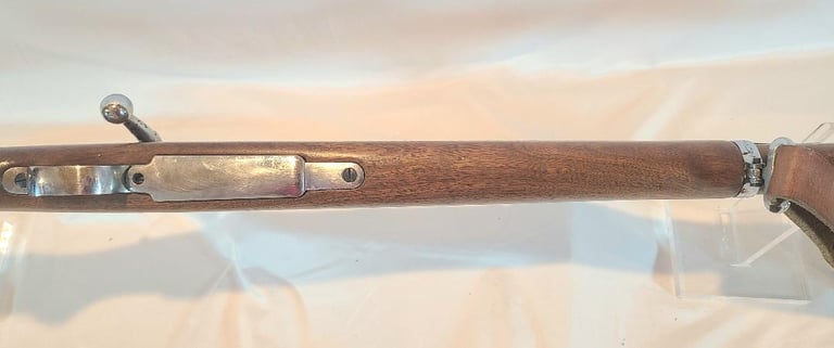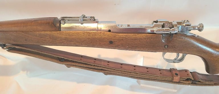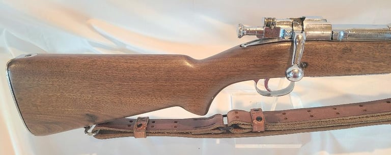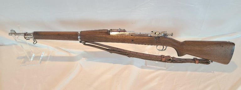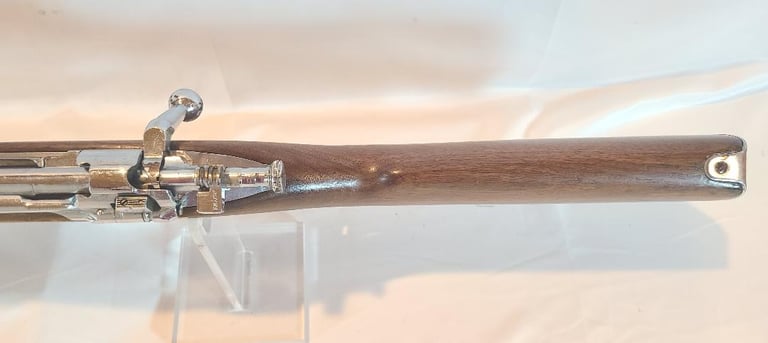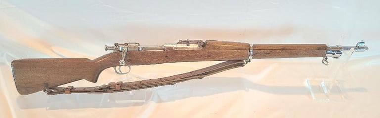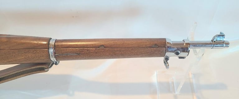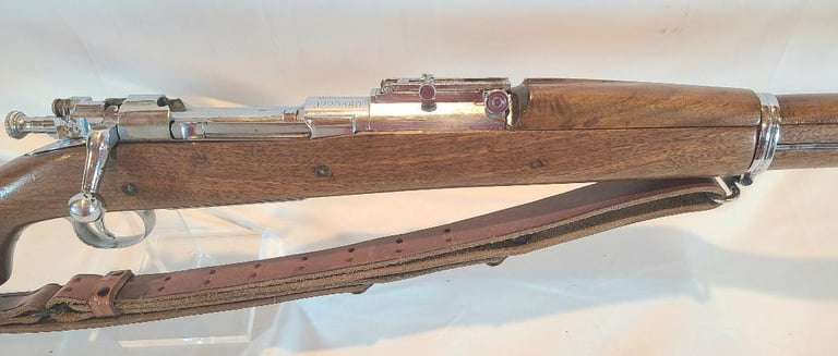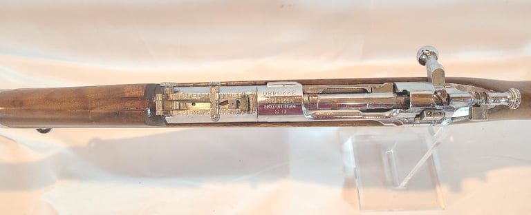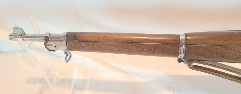 Here we have a Remington made Springfield 1903 Parade rifle. The metal has been chrome plated and the wood has been cleaned up. It is in good condition overall. The metal shows some flaking of the finish, mostly on the bolt, barrel band, muzzle and butt plate. The wood very good with some dings and scratches visible. The action works, but they firing pin has been removed.