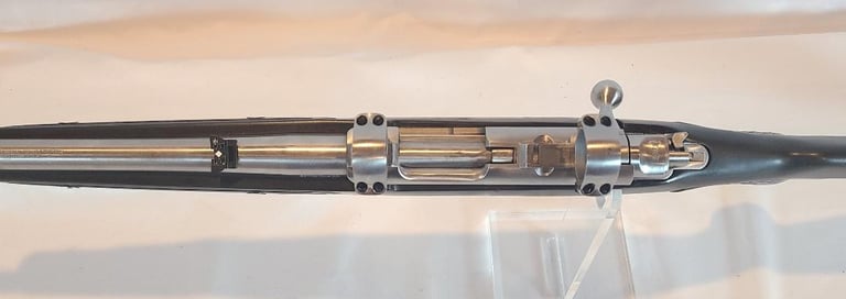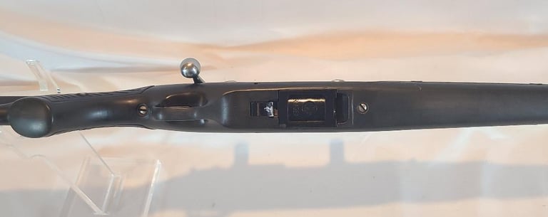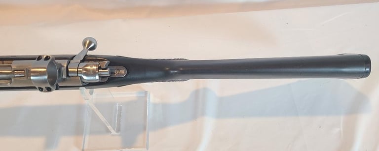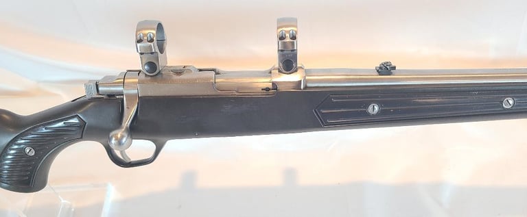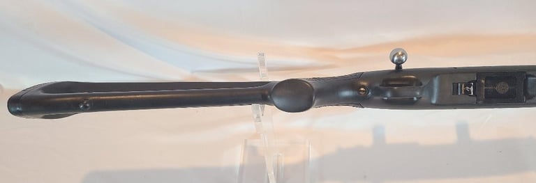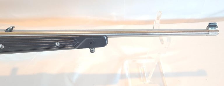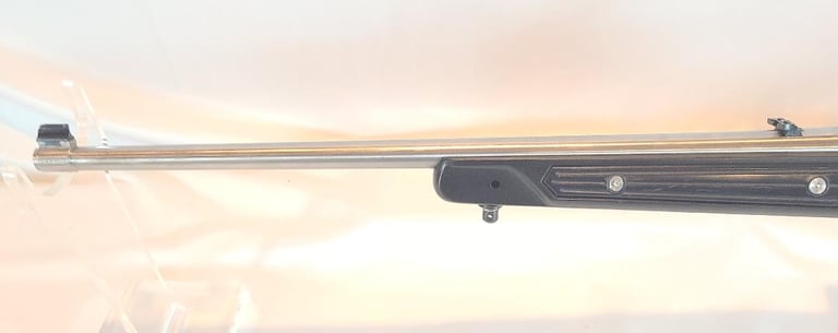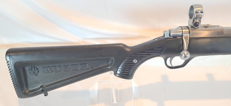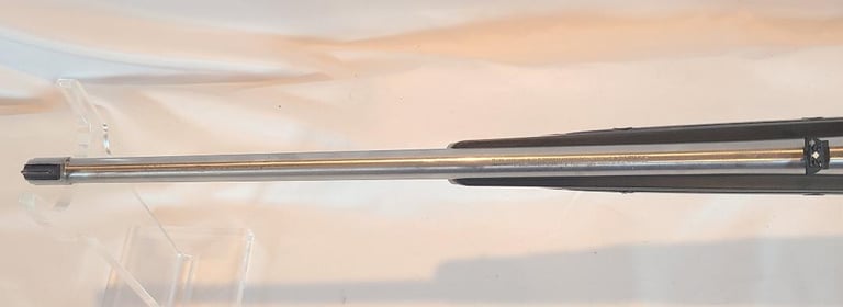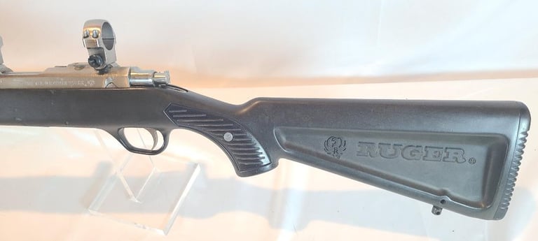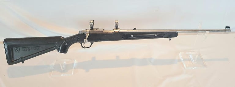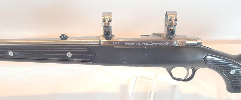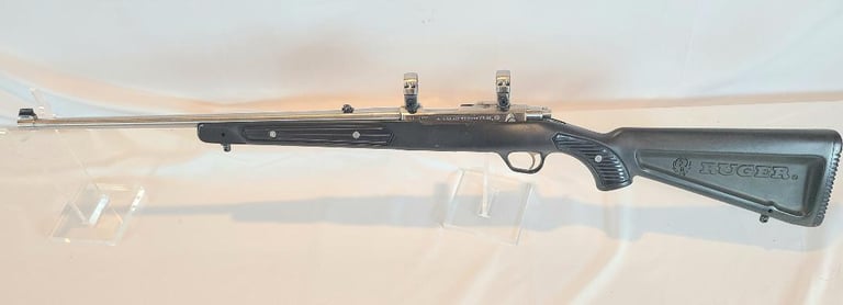 Here we have a Ruger All Weather 77/22 in 22 WMR with paddle style zytel stock. The barrel measures 20". They rifle is in very good condition overall. The metal shows minor handling marks and a bit of finish loss on the magazine release. The stock has a few dings near the receiver. The rifle appears to function properly and the bore is bright. It comes with a pair of stainless Ruger rings.