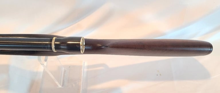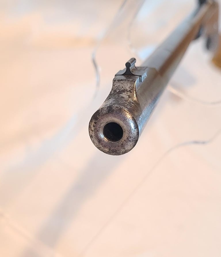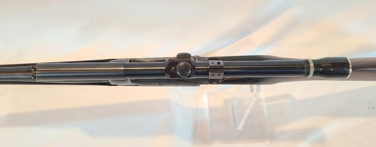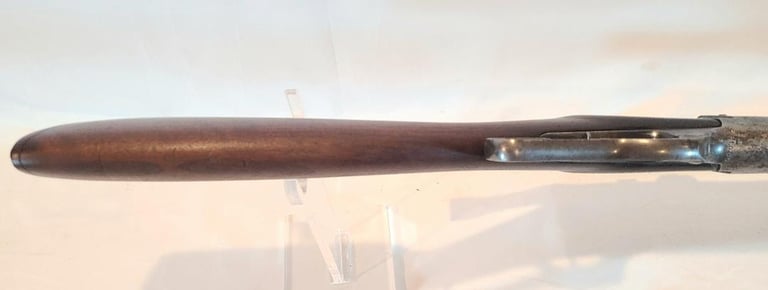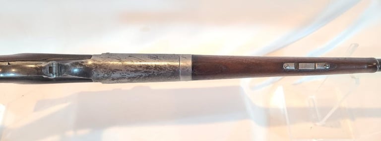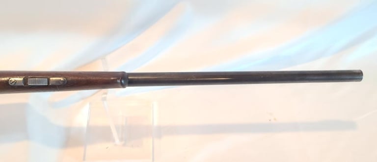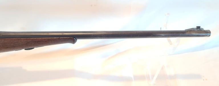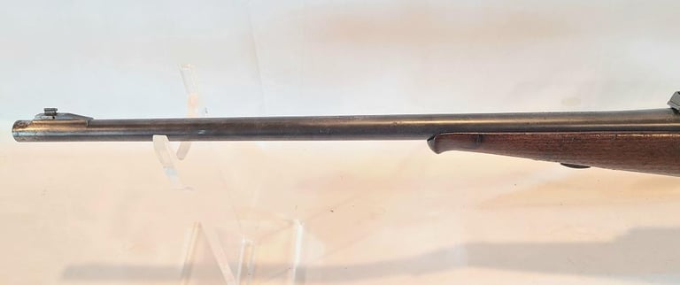 Receiver is patina, lever retains a moderate amount of finish, Barrel retains most of its finished with a bit of finish loss at the front. The wood shows a moderate amount of handling marks and a repaired crack from the right side of the top tang. The butt plate is nicely made serrated wooden piece. They rifle appears to function properly. Bore is nice and bright with minor wear.
