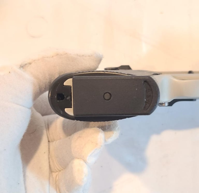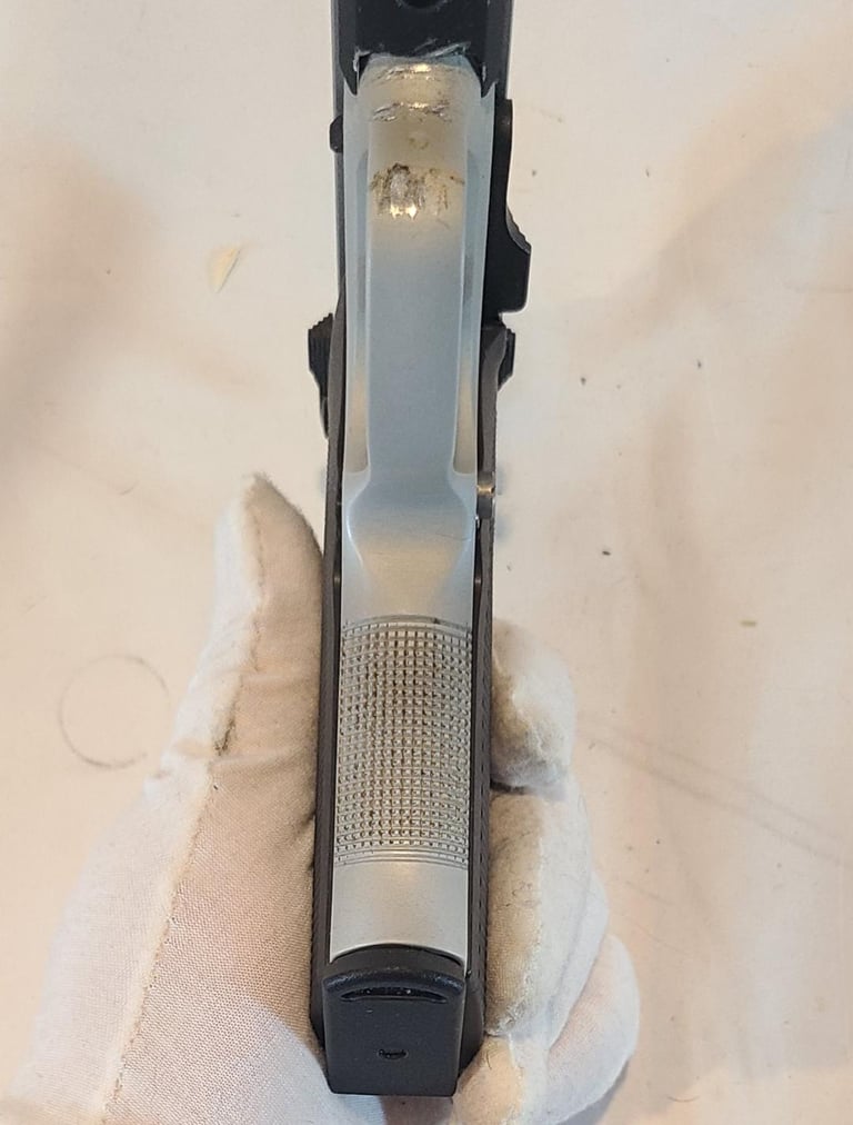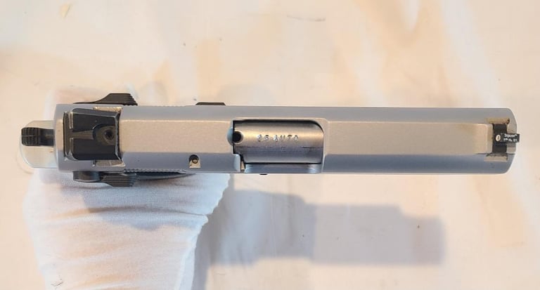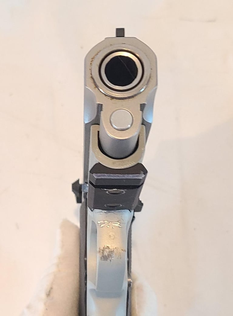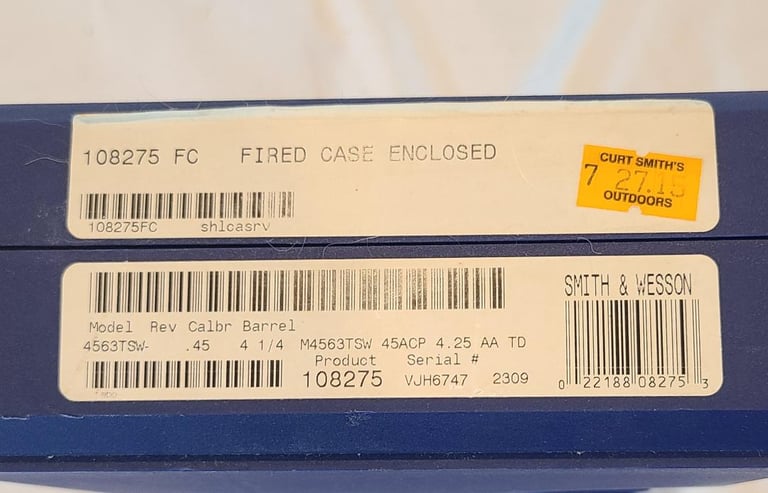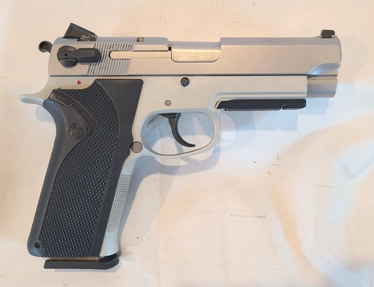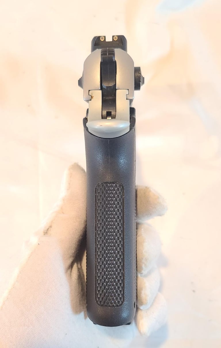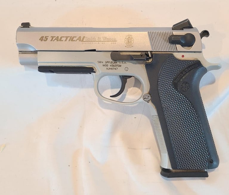Here we have a 45 Tactical Smith & Wesson model 4563TSW in 45 ACP. The pistol has some unfortunate scratches on the trigger guard and a little finish loss on the rail, but is otherwise in excellent condition. Appears to function properly. Comes with original factory case, extra magazine, paperwork, test casing.