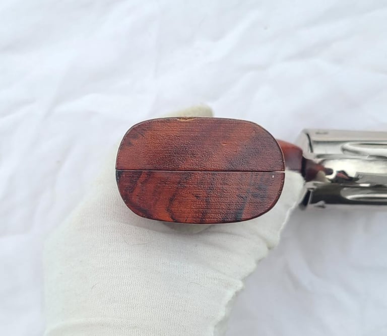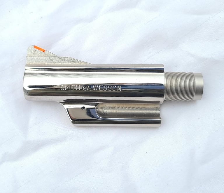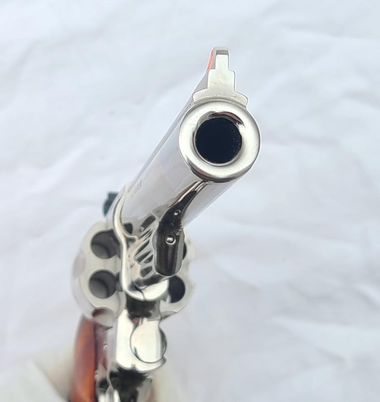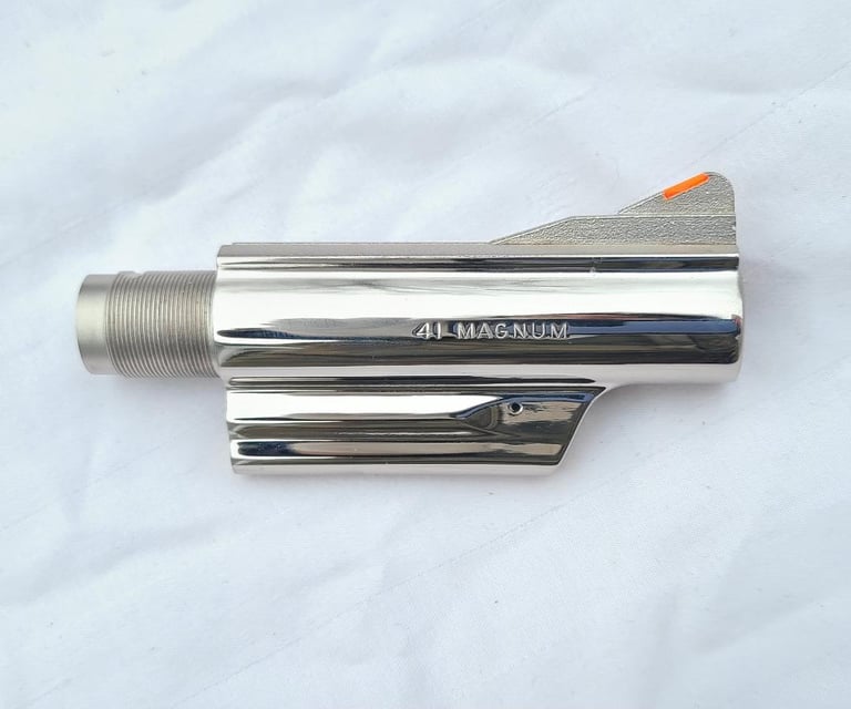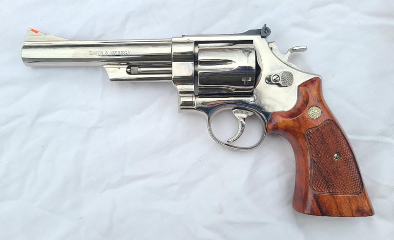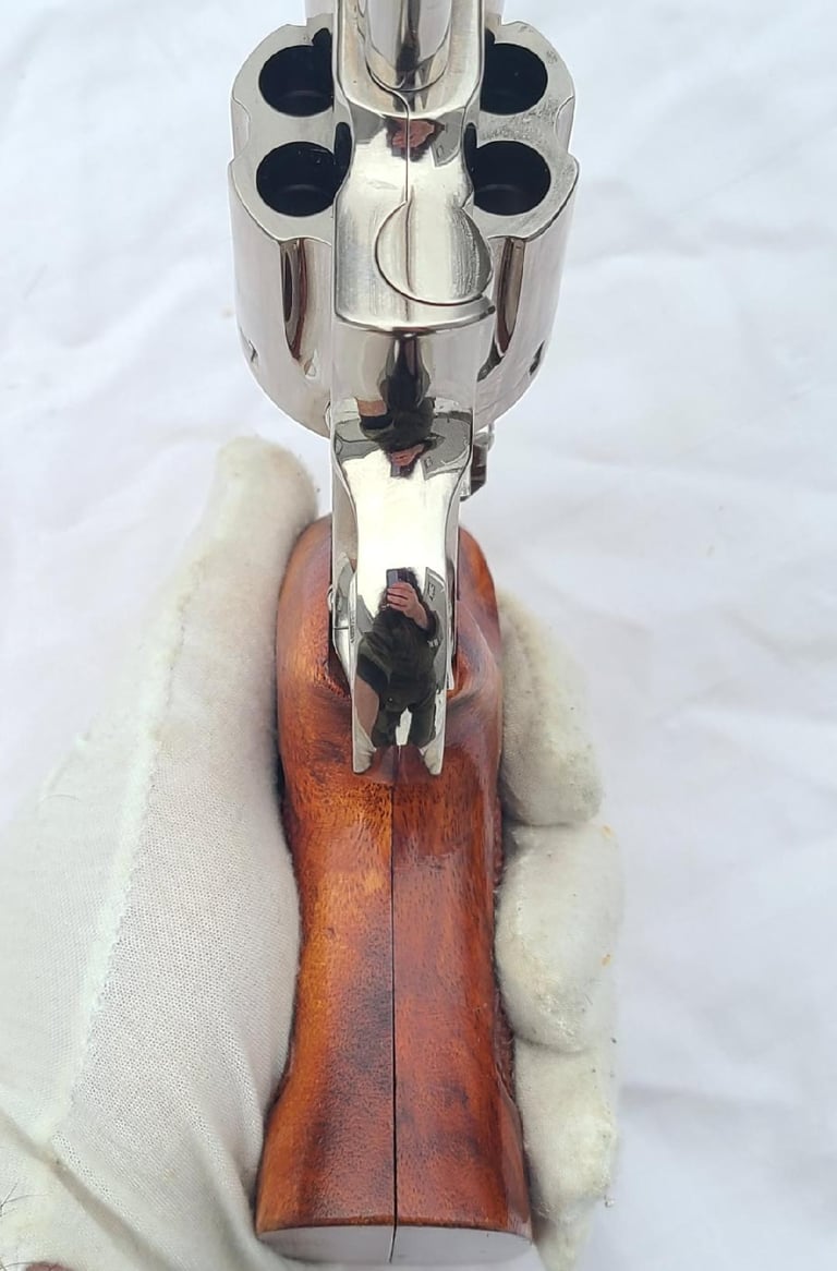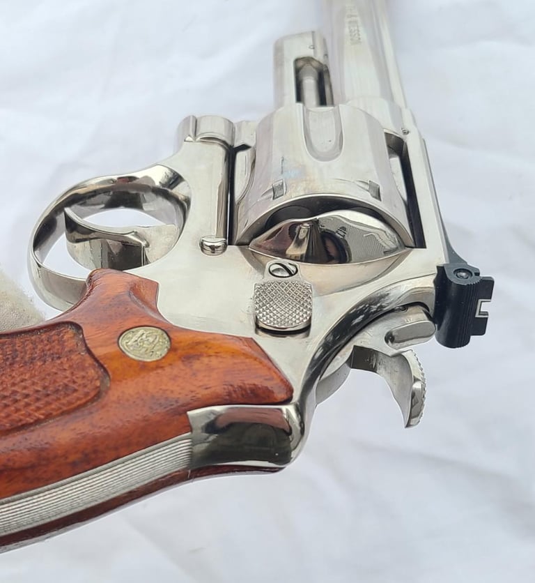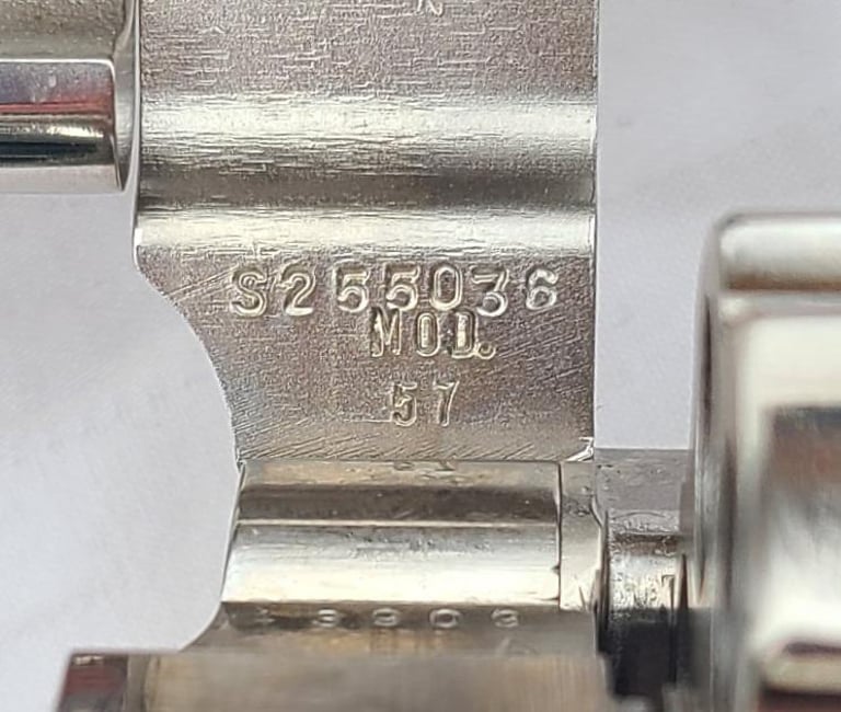 Here we have a Smith & Wesson model 57 (no dash) with nickel finish. It is currently fitted with a 6" barrel but a 4" barrel is also included. The cylinder yap looks a little tight, so, the 4" barrel may be the original to the revolver. Excellent condition with minor handling marks. Appears to function properly and lock up is good.