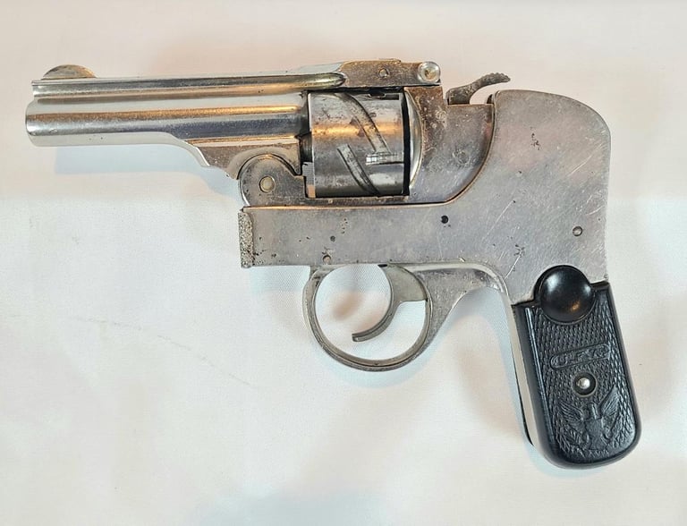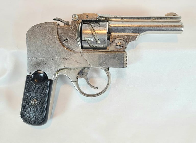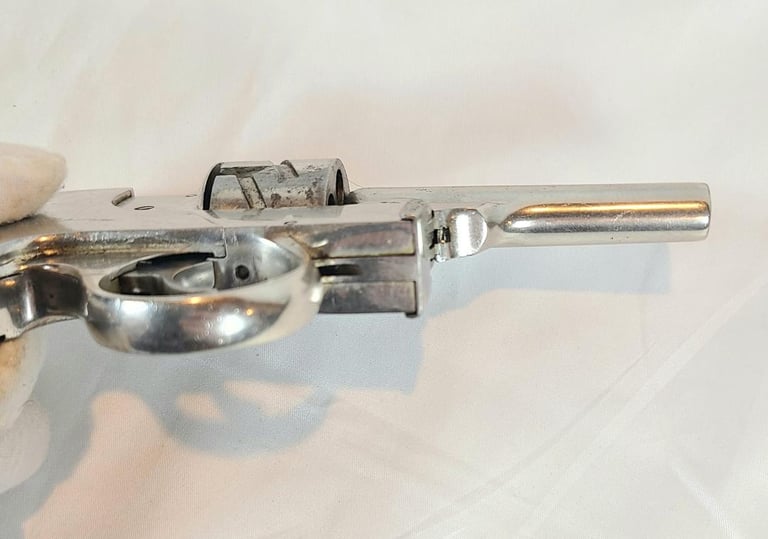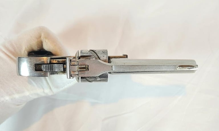 Here we have a Union Automatic Revolver. This is an extremely rare Autorevolver made by Union Fire Arms Co of Toledo Ohio. The design was patented by Charles Lefever. It is similar to the Webley-Fosbery and that it is top break and uses a zig zag cylinder. This example is number 117 of approximately 300 made. Interestingly, the manufacturer's markings on the side plate appear to have been stamped too far to the left and are partially cut off.