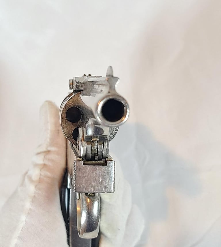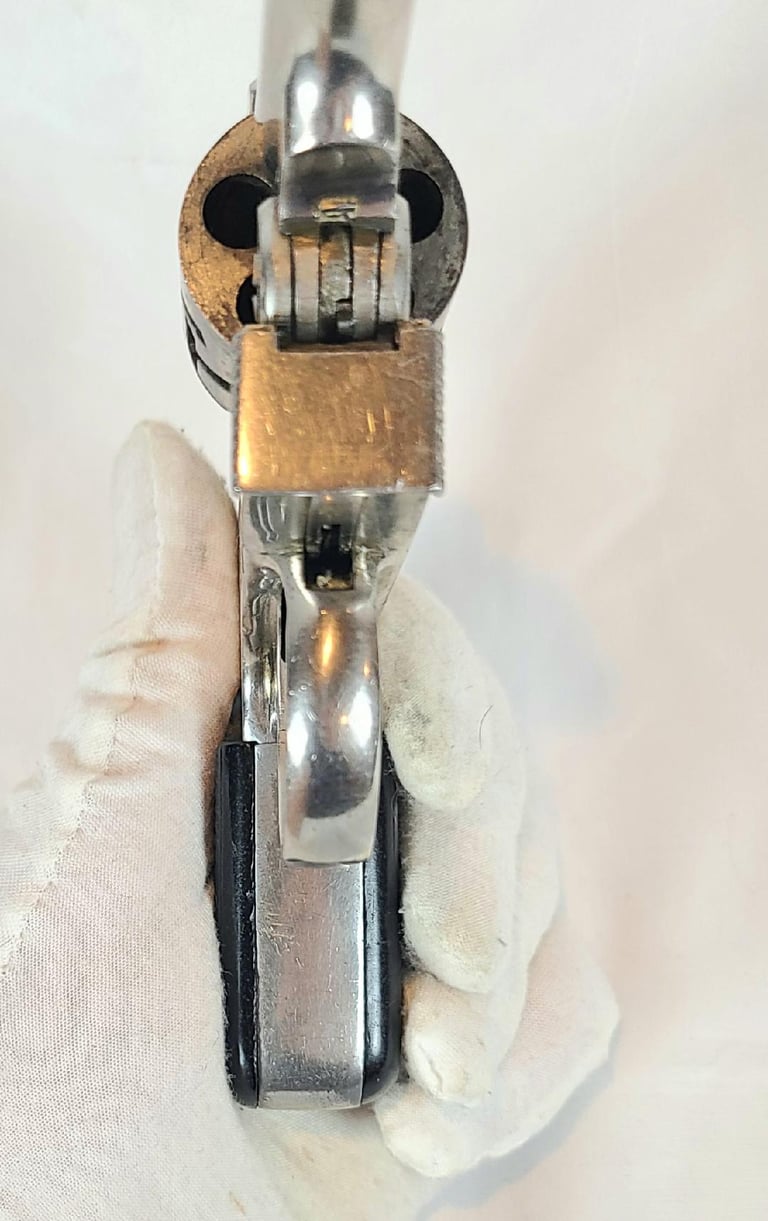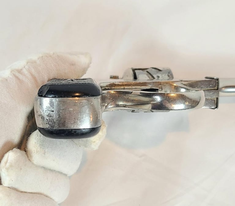 It is in in good condition overall with a variety of light scratches and a bit of flaking of the nickel plating. The cylinder and other working surfaces are a bit more heavily worn than the rest of the gun. There is a small chip missing from the top of the right grip.