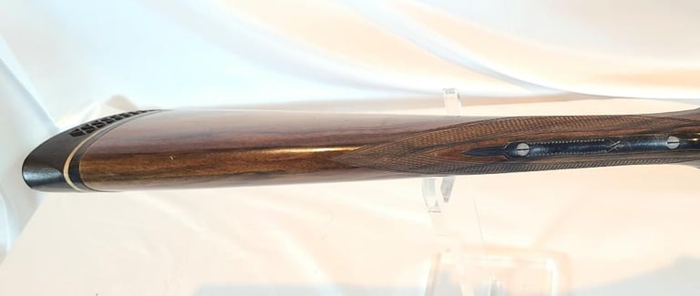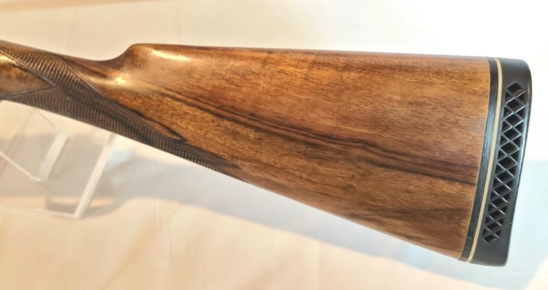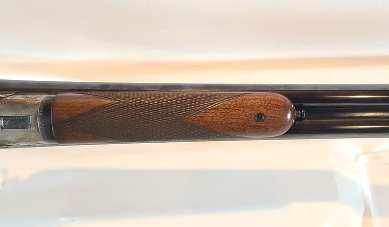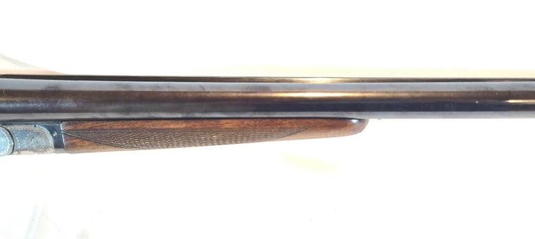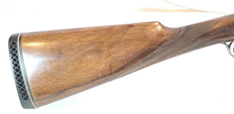 Here we have a Vincenzo Bernardelli Acciaio side by side 12 gauge hammer gun. The gun features a beautiful case color receiver, nicely figured straight English style stock and 28" barrel. They left barrel is full choke, the right barrel is improved modified. Lop is approximately 14.5" from the front trigger and 13.5" from the rear trigger. Recoil pad is not original, it is a pachmayr white line.