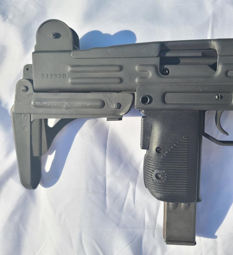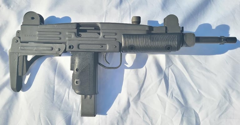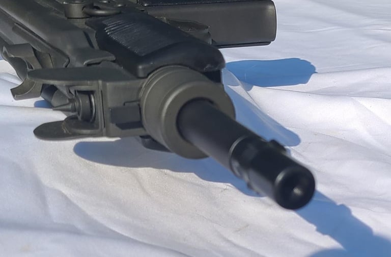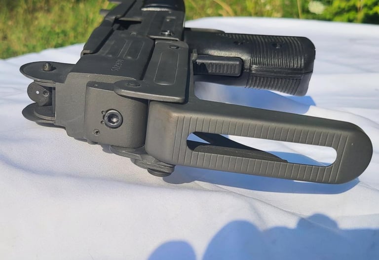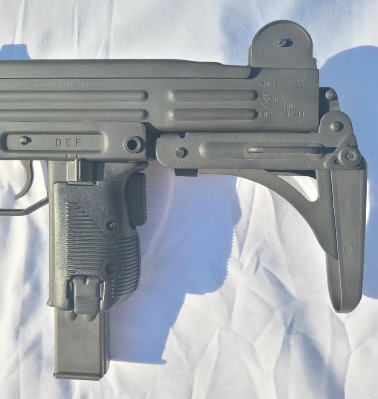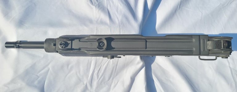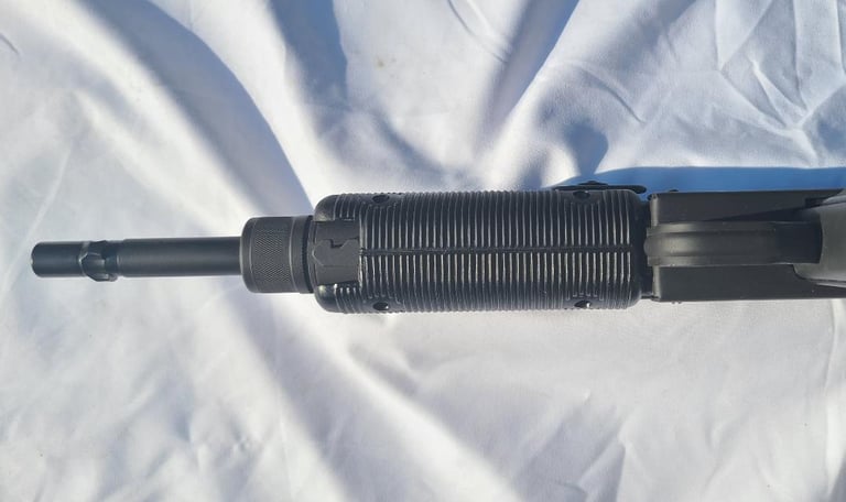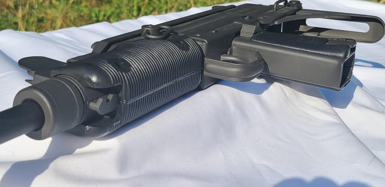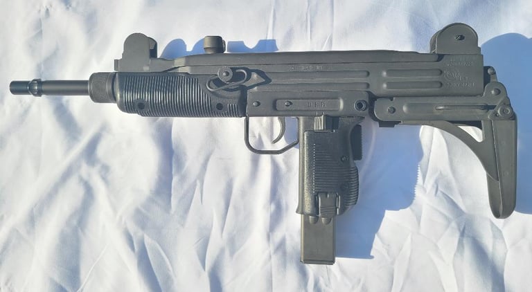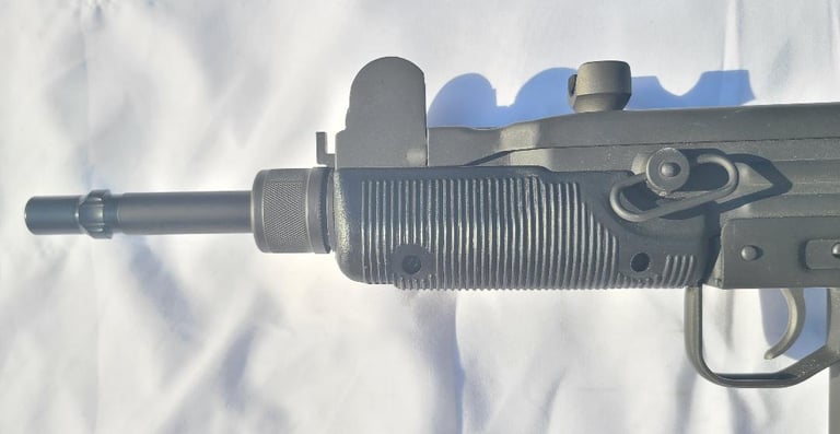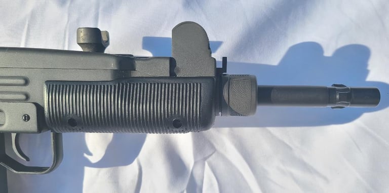 Here we have a Vector/Group Uzi short barrel rifle in 9mm. It has a 10" threaded barrel with tri lug thread protector. It is in there perfect condition with only light handling marks. It has been test fored and functions properly. It comes with one 25 round magazine.