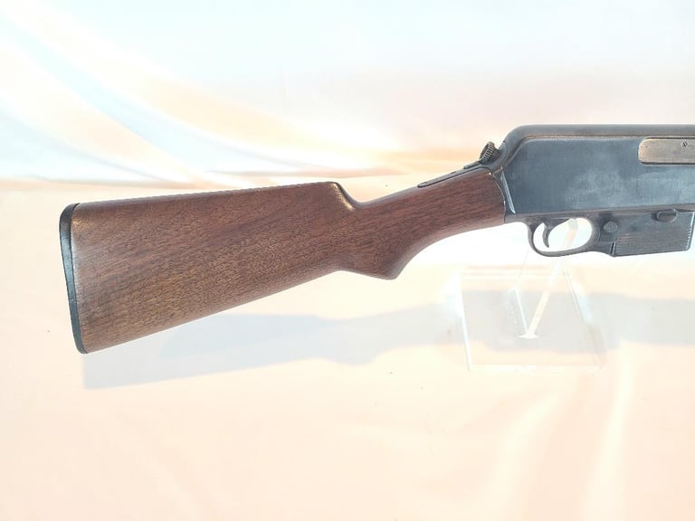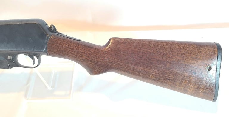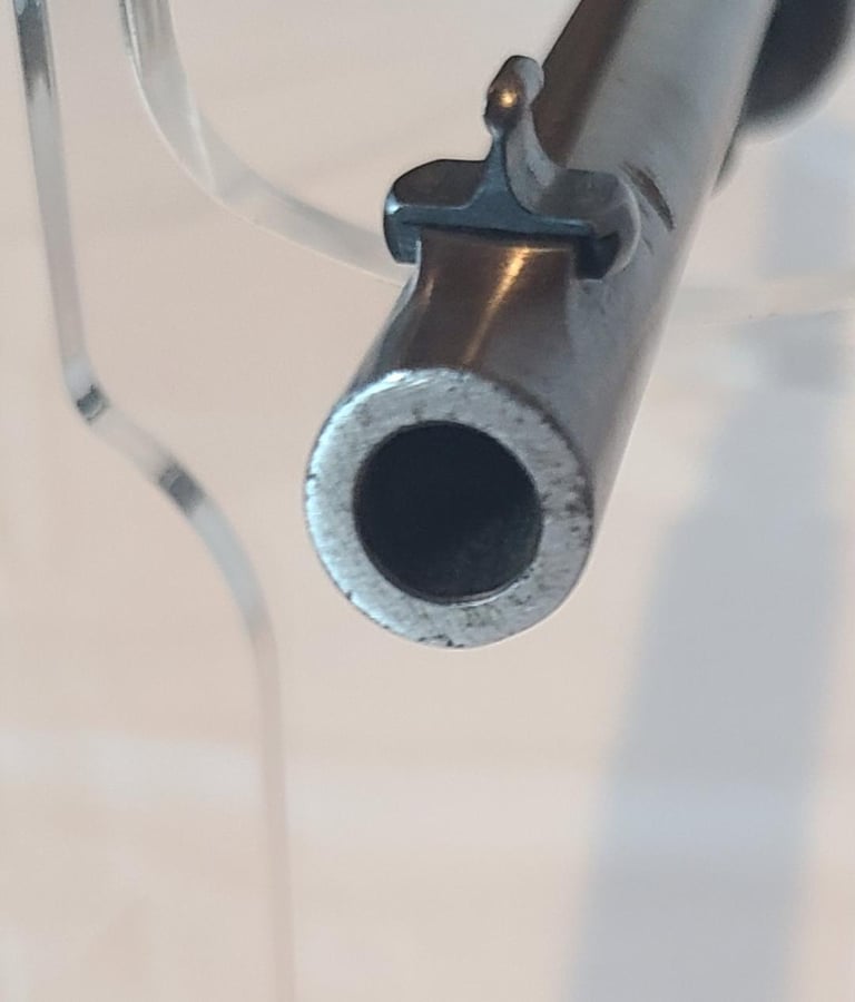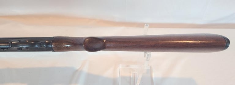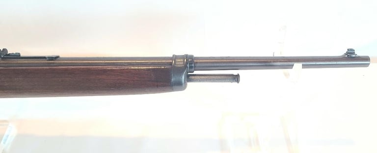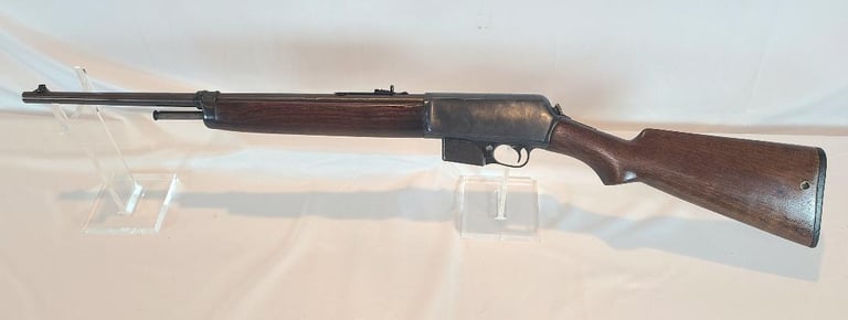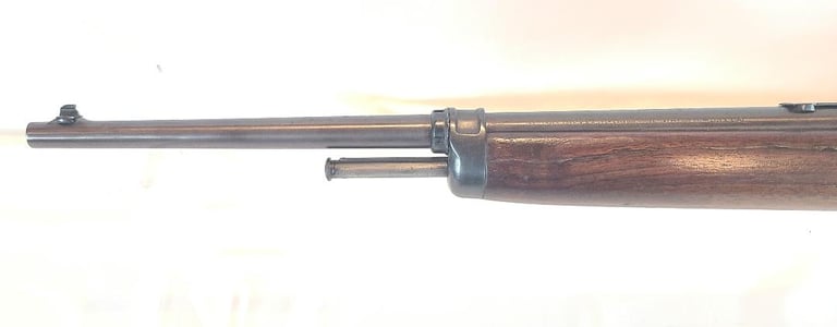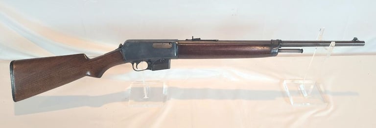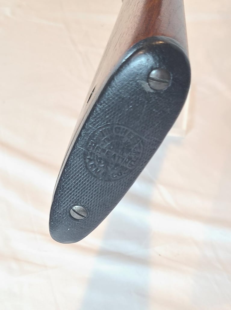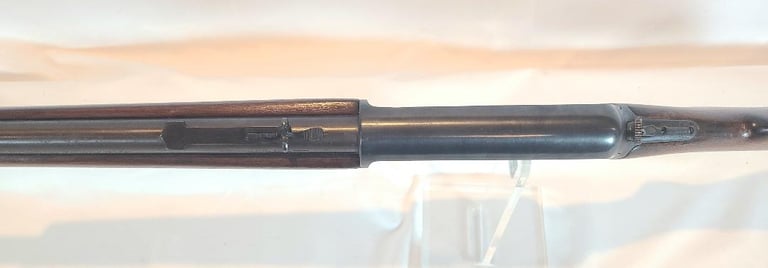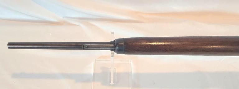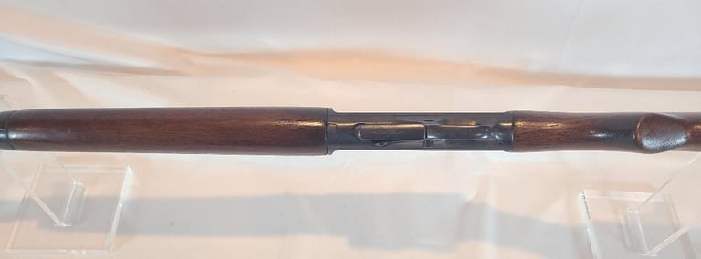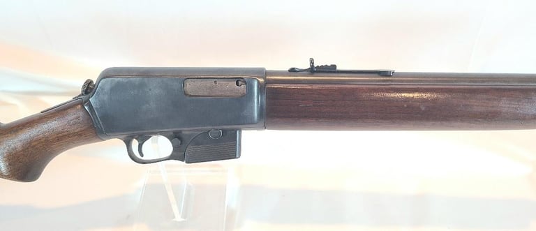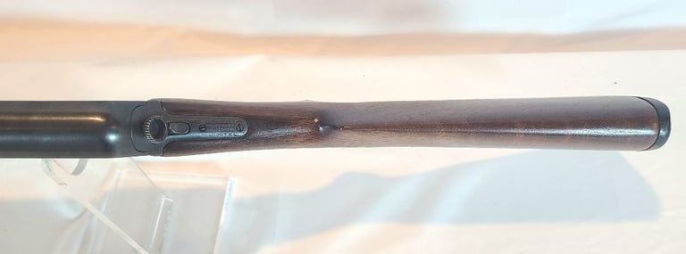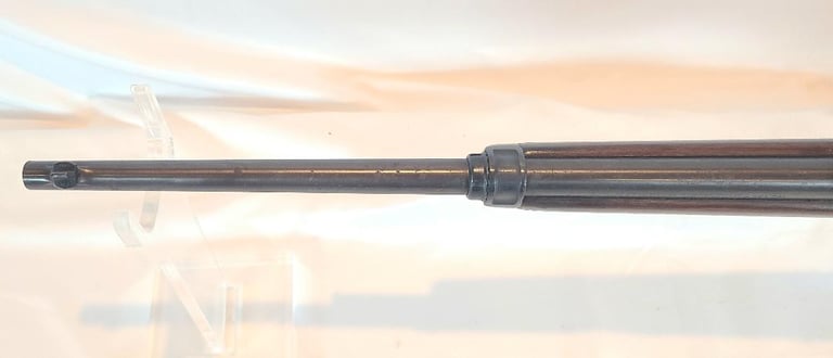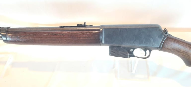Here we have a Winchester Model 1907 in .351 WSL. Barrel measures 20". Serial number is 21347 which states the rifle to 1909. The gun is in very good condition overall. Metal shows a little fading and some minor surface corrosion. The wood appears to have been refinished at some point, there are minor handling marks and repaired crack on the left side of the forend. There is also a small brass cup inlaid into the left side of the stock, the original purpose of which is unknown. Appears to function properly. Bore is excellent but could use a cleaning.