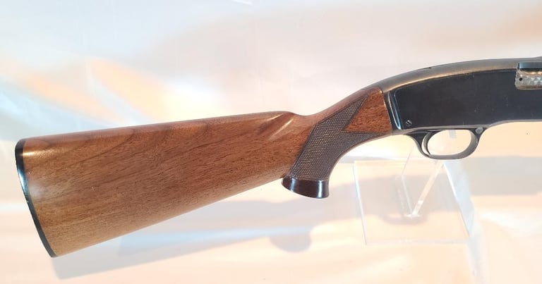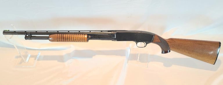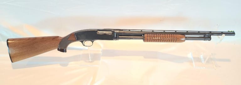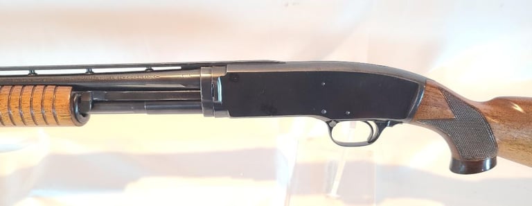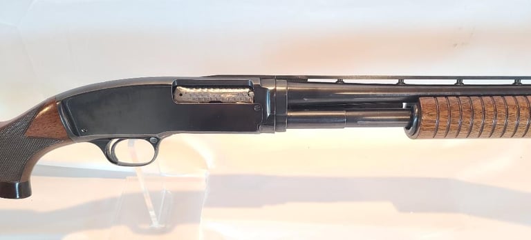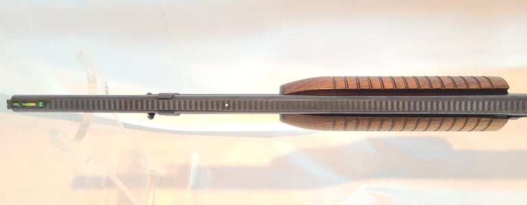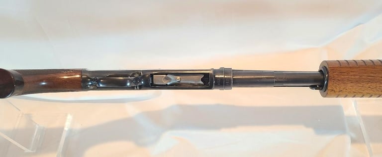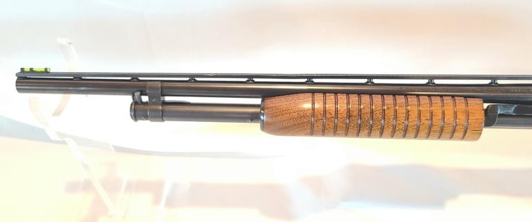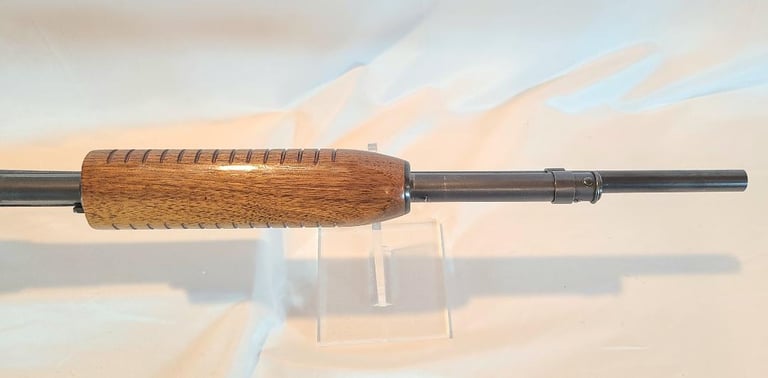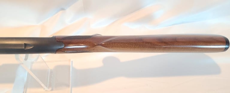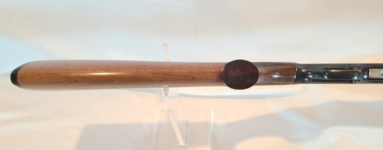 Here we have a very nice customized Winchester model 42 410 shotgun. It has a 23" vent rib barrel with green fiber optic sight and takes choke tubes. The barrel has had the forcing cone lengthened and the rib is a simmons. They shotgun has an excellent simmons reblue with some minor handling marks and a bit of finish loss on the edges and from the action being worked. The gun appears to function properly and the bore is bright. It comes with a mod tru choke.