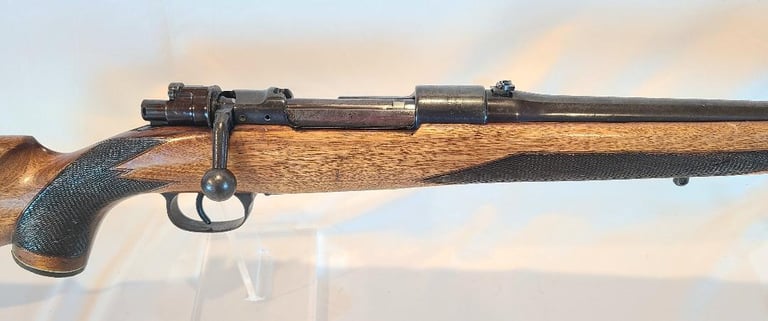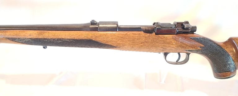 Here we have a DWM 1916 Mauser 98 that has been converted to Sporter configuration and rebarreled to 30-06. Barrel measures 22". Features include globe front sight, flip up rear sight, checkered Monte Carlo stock, right side of receiver drilled for peep sight.