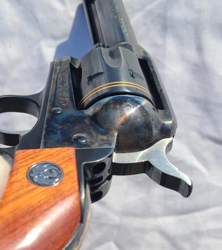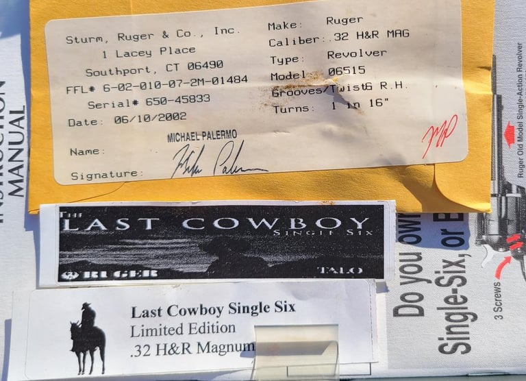 Here we have a new in box condition Talo exclusive "The Last Cowboy" Ruger Single Six in .32 H&R. The gun appears generally unused but has a very faint turn line and a minuscule mark near the muzzle. Comes with original box, paperwork, lock, test case.